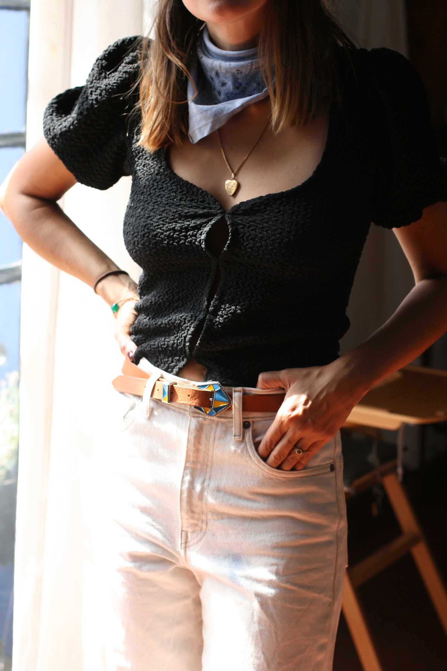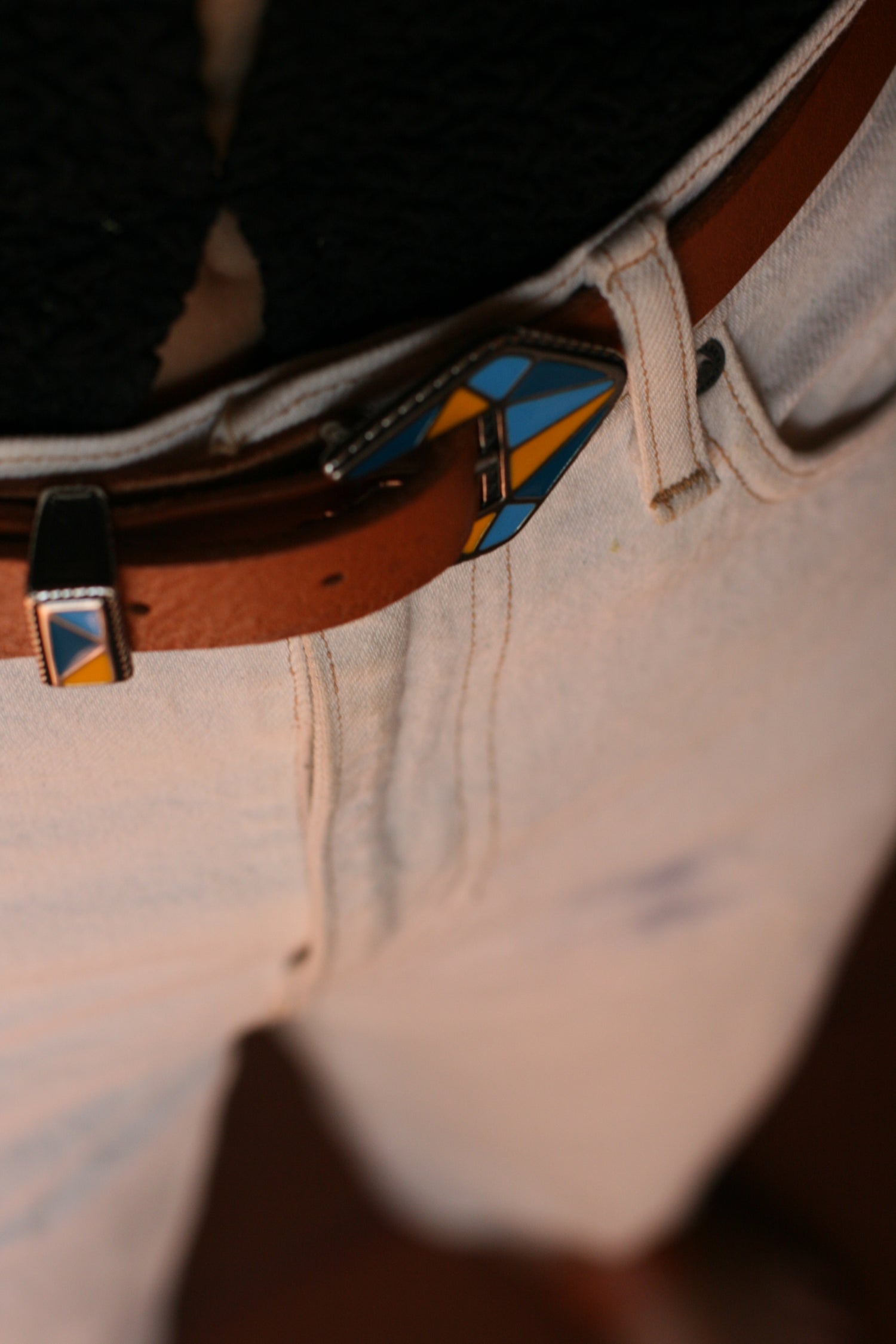 Ceinture qui se porte sur un pantalon taille haute, un jean, elle mesure 2 cm de largeur.