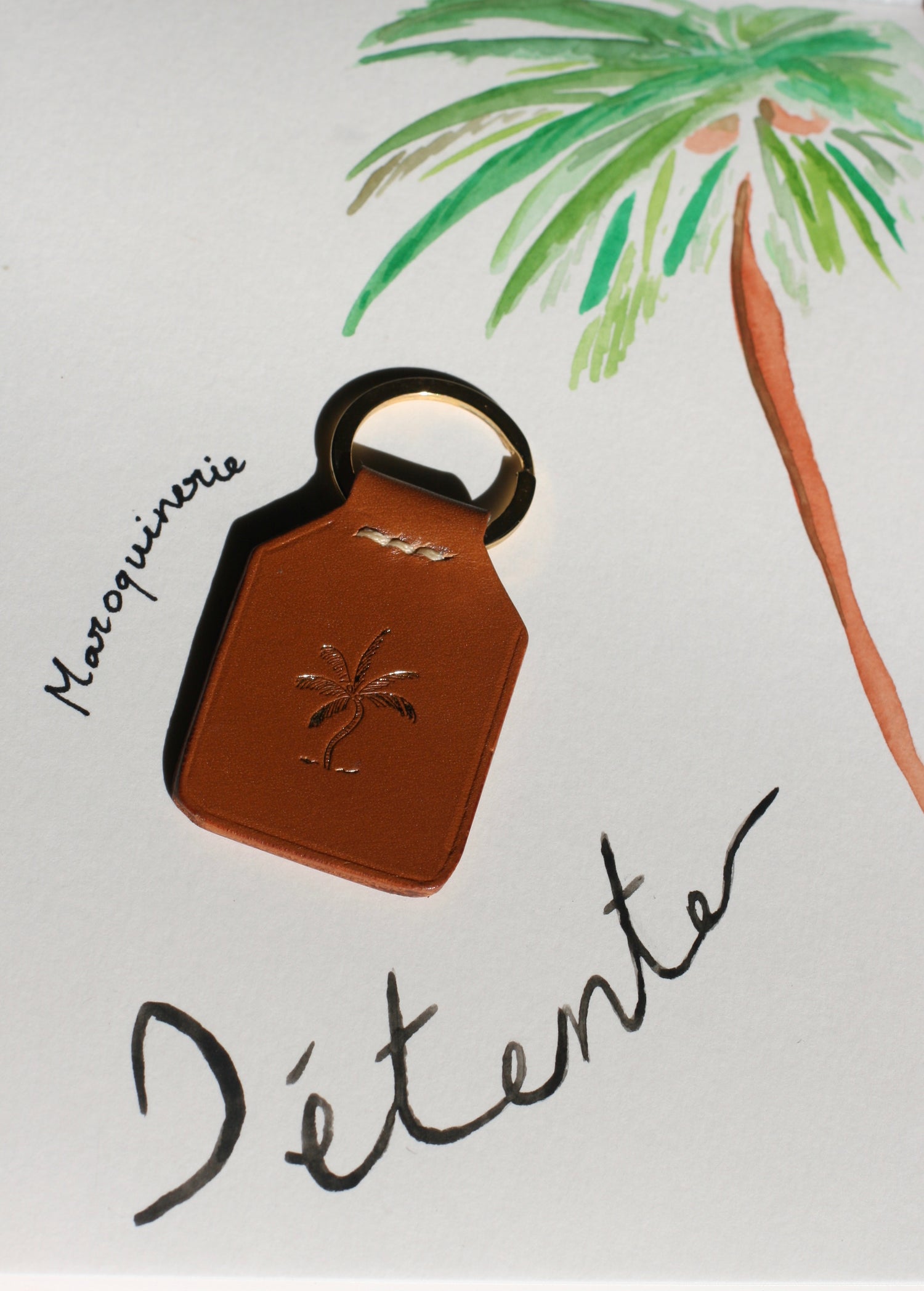 Porte-clés en cuir tannage végétal camel embossé avec un palmier doré.