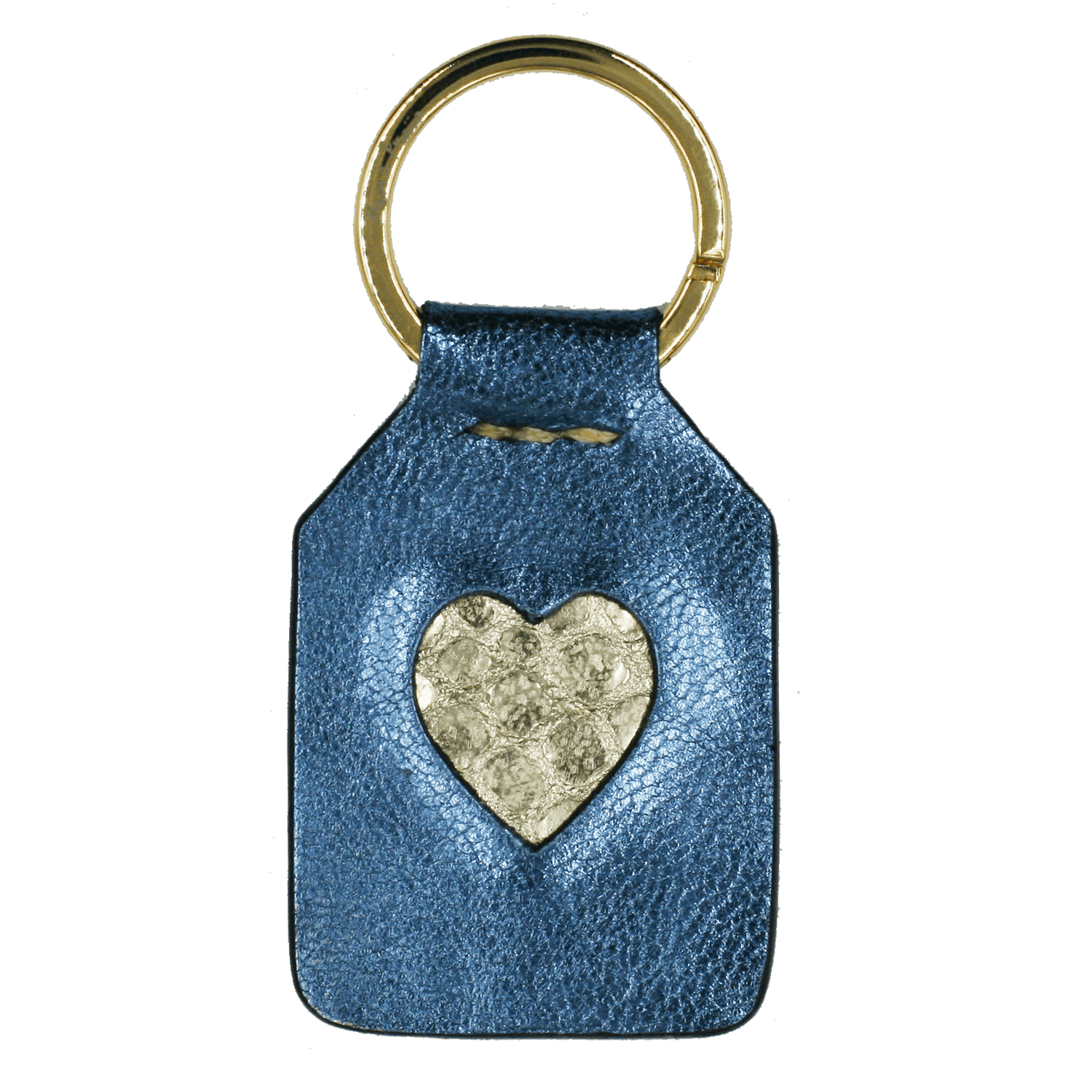 Porte-clé en cuir bleu disco avec un coeur argenté