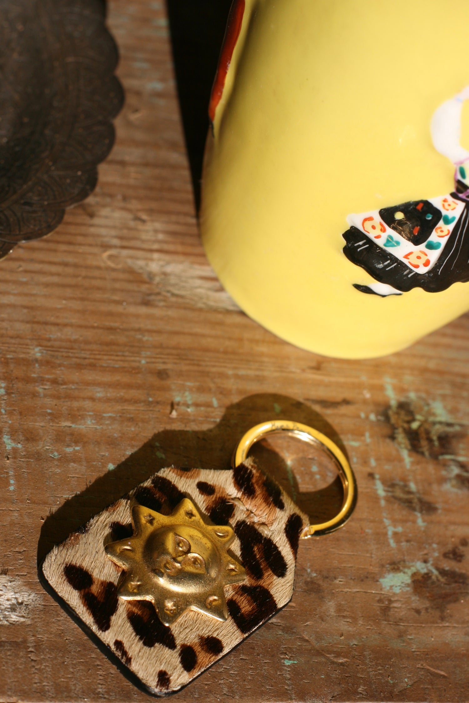 Porte-clés en cuir tacheté léopard orné d'un soleil doré