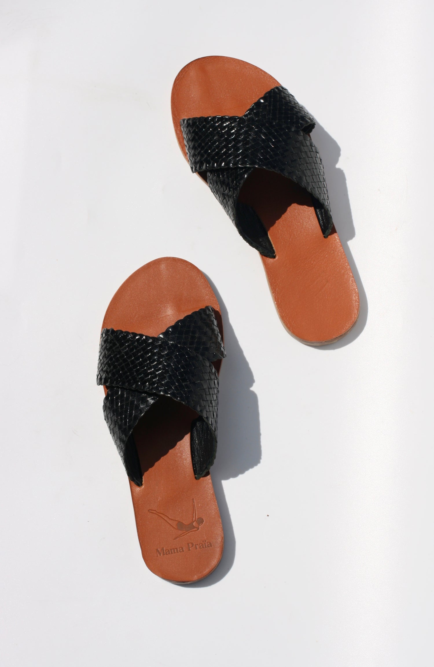 Cuir tressé noir vernis upcyclé en France. Doublure intérieure en veau.