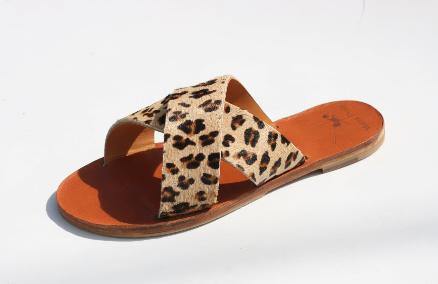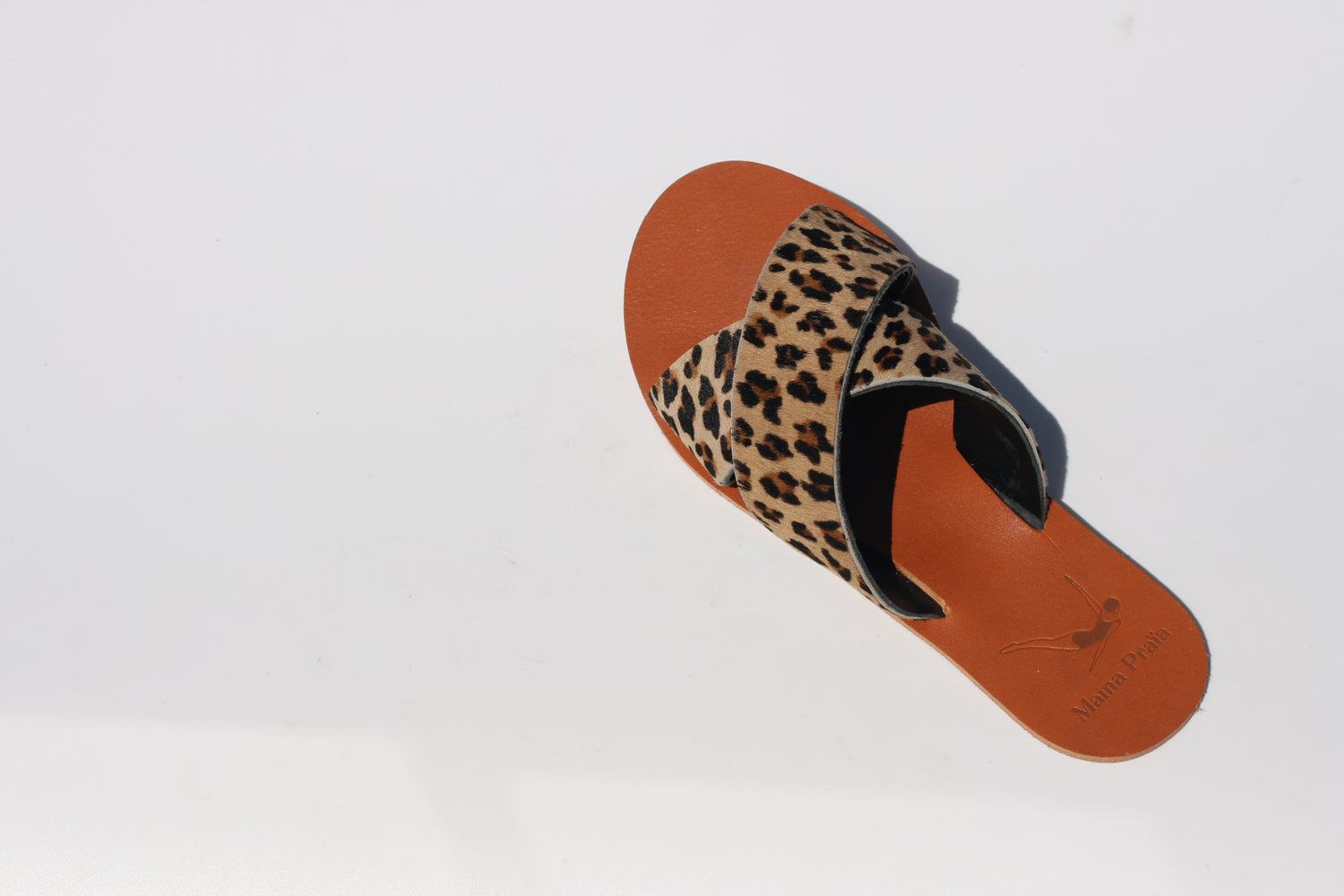 Leopard faux fur leather upper with soft brown veg-tanned lining.